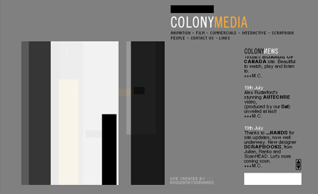 Website design and implementation for COLONYMEDIA, a collective of creatives including artist Dave McKean and web artist Golan Levin amongst others.