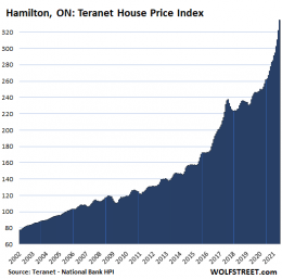 In Hamilton, Ontario, home prices were up 3.8% in June from May, and a staggering 28.0% year over year, thank you Bank of Canada hallelujah. But now the BoC, with an eye on this exponential rise in house price inflation, is withdrawing its sweeping monetary policies. Here too, the housing market had started to decline and falter in 2017, and it was the BoC’s pandemic policies that triggered this spike: