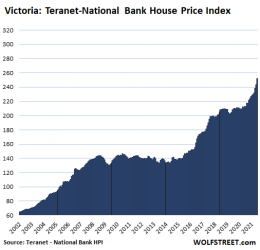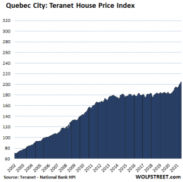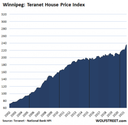 In Winnipeg, house prices jumped 1.3% for the month, the smallest increase since March, a sign of this “deceleration”, and are up 9.9% year-on-year. Here too, house prices stabilized in 2013, but BoC policies let them down: