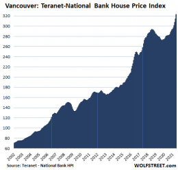 In Greater Vancouver, house prices jumped 2.7% in June from May and are up 14.7% year-on-year, according to the Teranet-National Bank House Price Index today. Note how the Bank of Canada’s radical monetary policies from March 2020 reversed the Vancouver real estate crisis that had already been underway for a few years: