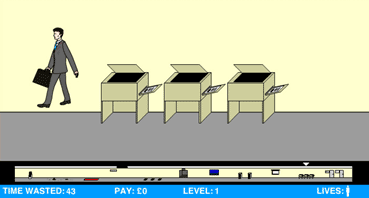 BASED ON THE CLASSIC 80'S ATARI GAME-'PITFALL' THIS CONTEMPORARY VERSION SETS YOU WITHIN A HORRIFYING OFFICE ENVIRONMENT. AVOID FILING CABINET DRAWERS, PLUMMETING SALES CHARTS, PICK UP INCENTIVE PACKAGES AND ESCAPE TO THE ROOF.